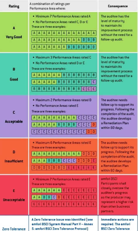 BSCI認(rèn)證審核結(jié)果分為 A,B,C,D,E五個(gè)級(jí)別,C級(jí)別以上的工廠,買家一般都是認(rèn)可的。要注意哦,BSCI認(rèn)證的結(jié)果是以報(bào)告的形式出現(xiàn)的,它沒(méi)有證書的,切記!切記!
